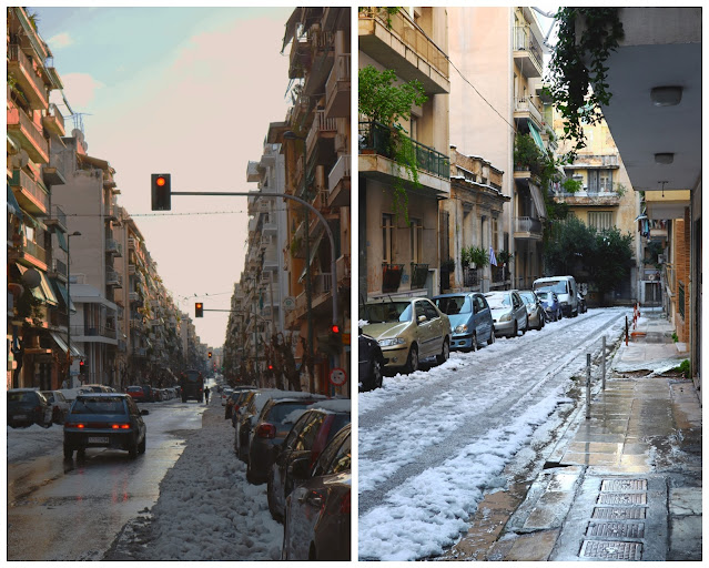 During the Monday a heavy snowfall covered Athens and more or less paralyzed the society. Snow is common in the Greek mountains and in the northern part of the country, but is more infrequent in central Athens and on the islands and the society isn't built for it. Last year the snow fell too, but it only lasted for a short time. This time the snow kept falling, and falling... and some parts of Athens had as much as 1,5m of snow.
